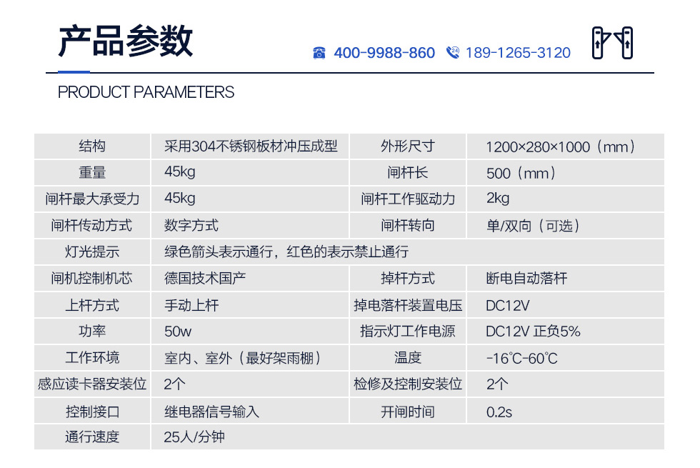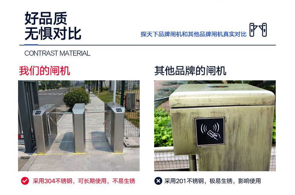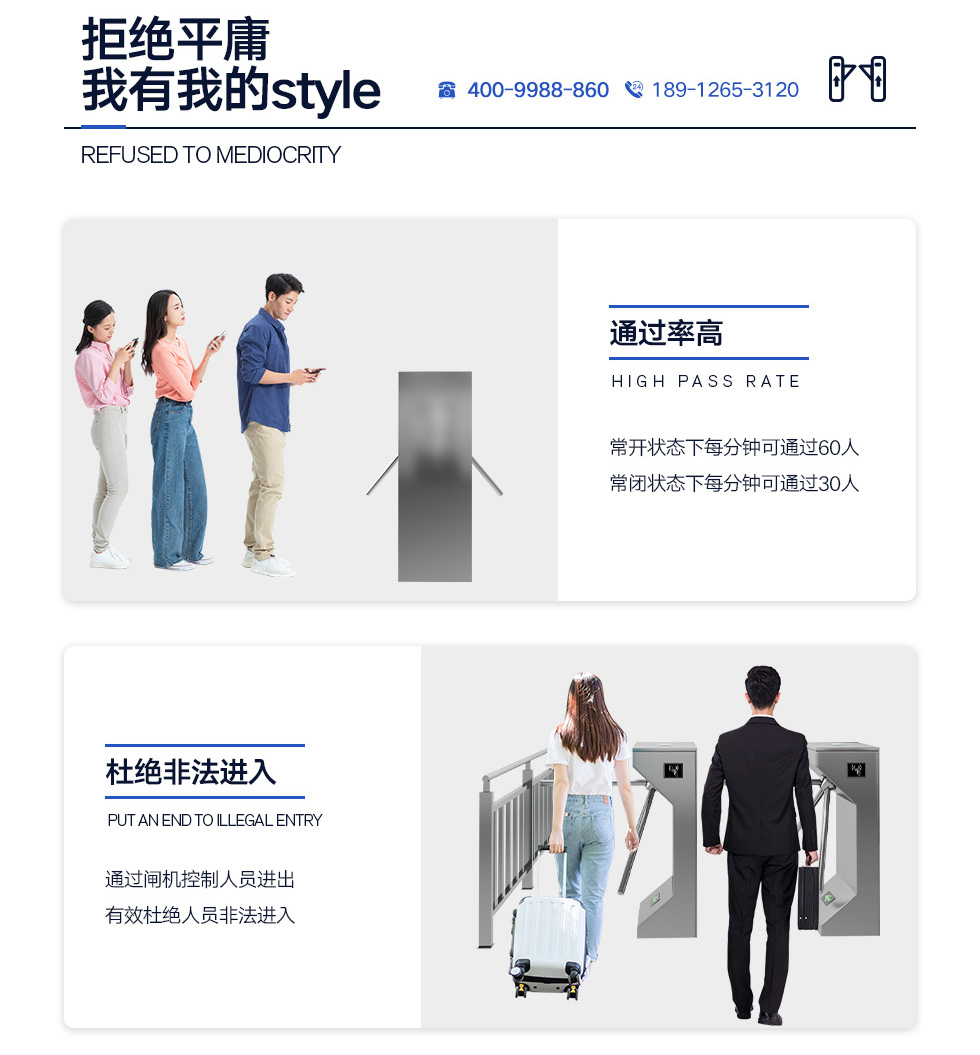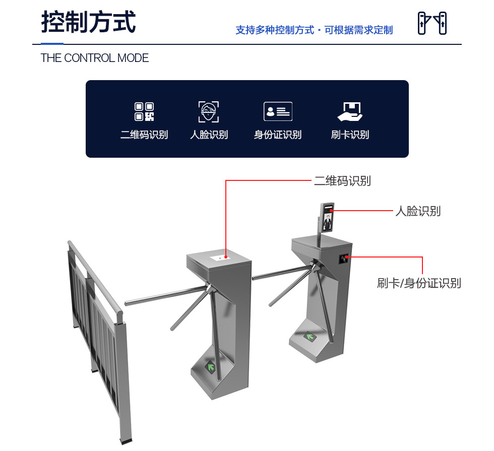 三輥閘是我公司自行開發、研制、生產的智能通道管理設備,通過配置不同的讀寫設備,即可完成對通道通行的智能化控制與管理。整個產品外形采用不銹鋼板沖壓成型,造型美觀大方,防銹、耐用,且系統對外采用標準電氣接口,可方便的將條碼卡、ID卡、IC卡等讀寫設備集成在本設備上,從而為出入人員提供有序文明的通行方式,并可杜絕非法人員進出,同時為了滿足消防通道的要求,在緊急情況下停電落桿,組織人員疏散。