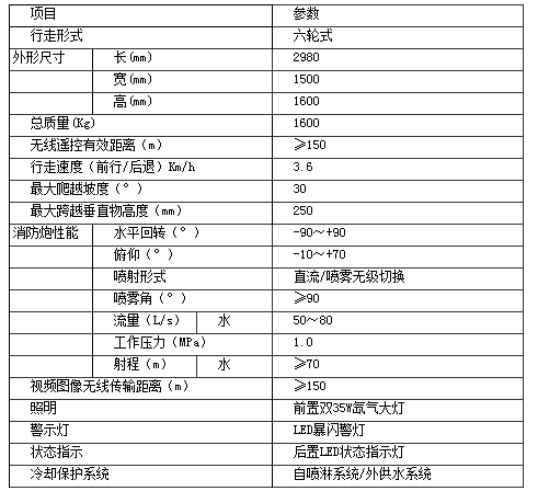 該機器人整體結構由底盤、遙控器、電控炮和電液控制系統等組成。操作人員通過遙控器控制車體行走。利用車體自帶的水箱中的水由液控泵或后方水帶所供的水進行噴霧自衛保護。控制炮的左右回轉及俯仰運動來調整滅火劑的噴射落點。采用六輪式行走,越野性能好,具有很好的通過性。能在泥濘、崎嶇不平的路行駛,并能跨越250mm垂直障礙物及30度斜坡。系統操作使用可靠方便。作為高科技產品的消防滅火機器人能對各種滅火場合提供嶄新的消防滅火技戰術手段。